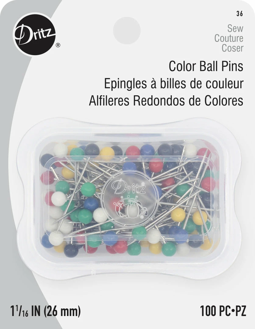 Dritz Color Ball Pins are ideal for general purpose sewing and medium weight fabrics. These straight pins are rustproof and are easy to see and handle.