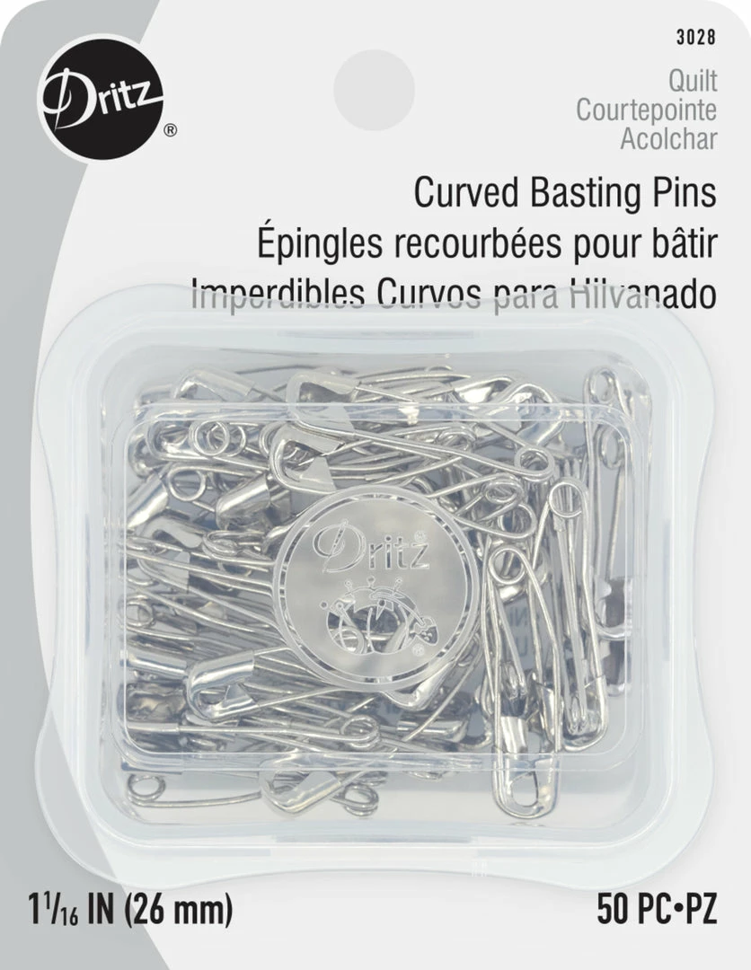 Use the Dritz Curved Basting Pins for an enhanced quilting experience. When it comes to quilt basting, these curved safety pins have an advantage over straight pins. They feature a nickel-plated finish and are perfectly angled to penetrate right through multiple layers of quilt without bending. Easy to use and sturdy, these safety pins are a great pick for your next quilting project. This package includes 50 1-1/16-inch curved basting pins.