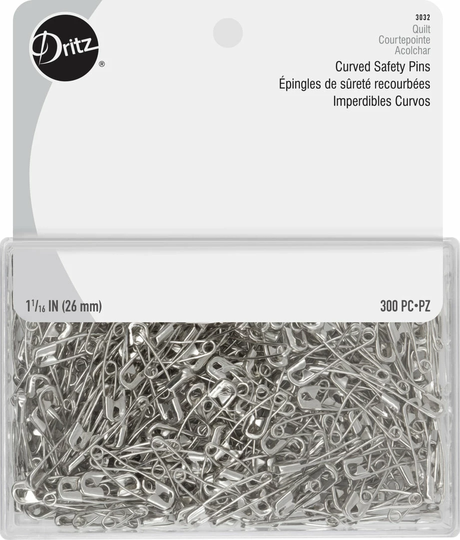 Make quilt basting a breeze with the Dritz Quilting Steel Curved Safety Pin Pack. This pack comes with 300 nickel-plated, steel safety pins that are specially designed for quilt basting. These curved pins are easier to use than the straight pins and come with an accurate angle that helps penetrate through quilt layers without shifting. Packaged in a reusable, clear box, these pins are convenient to store.