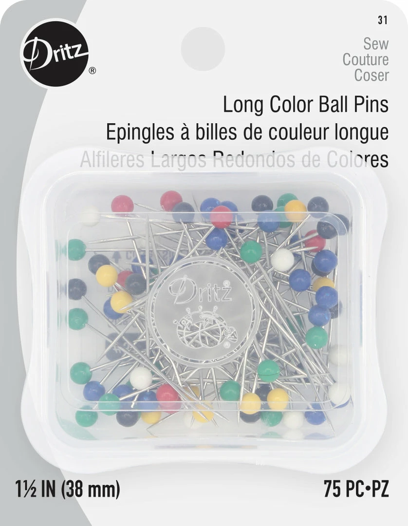 Dritz Long Color Ball Pins are ideal for general purpose sewing and medium weight fabrics. These stainless steel straight pins are rustproof and feature multi-color heads that are easy to see and handle.