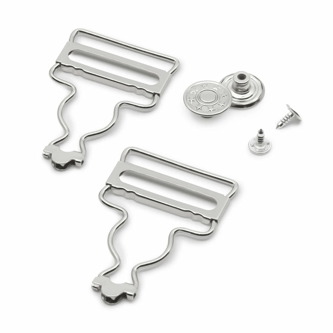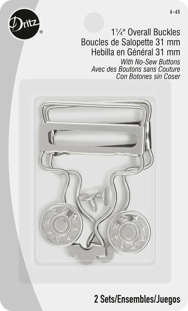 Dritz overall buckles with no-sew buttons are ideal fasteners for both apparel and accessories. Use for DIY sewing projects as well as repairing, replacing or adding buckles to store-bought garments. This package contains 2 no sew buttons and 2 buckles for 1-1/4″ wide straps.