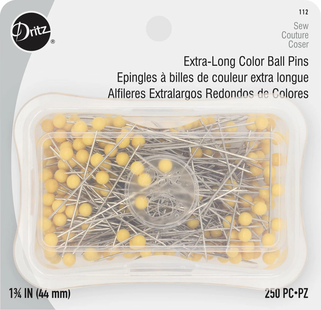 Dritz Extra-Long Color Ball Pins are ideal for lofty fabrics, quilt basting and home decor sewing. Large yellow heads are easy to see and handle. Extra long .6mm nickel-plated steel shaft.