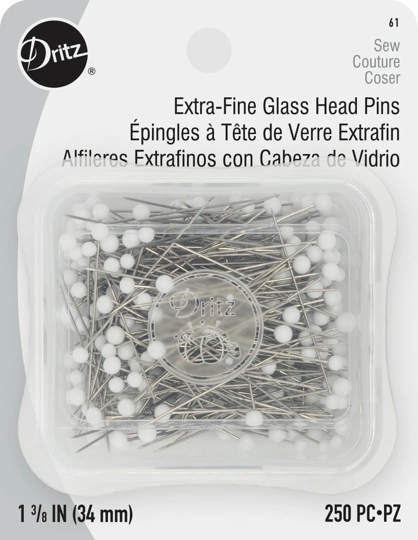 Dritz Glass Head Pins are heat-resistant and can be ironed over without damaging fabric. These pins are designed to pierce through delicate fabrics and are great for machine piecing. Nickel-plated steel
