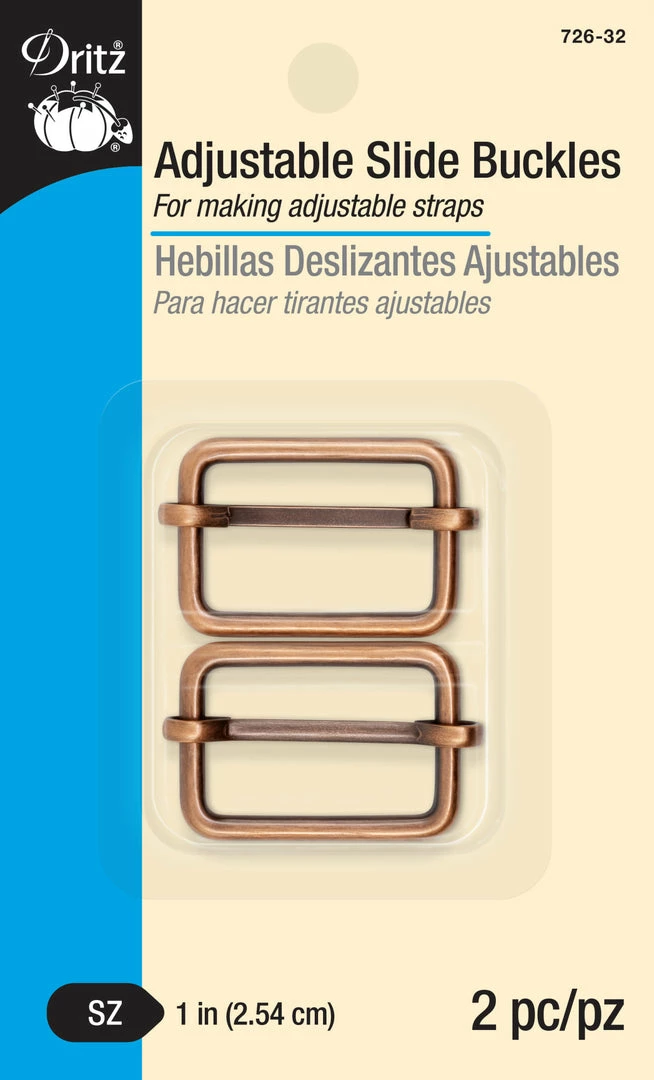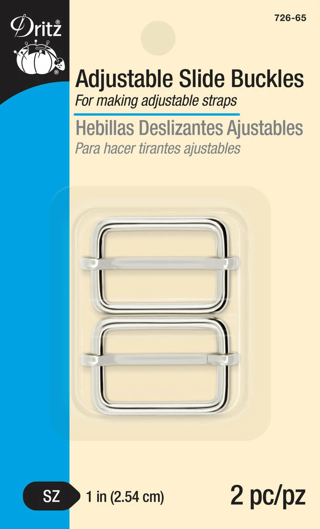 The Adjustable Slide Buckles by Dritz are designed to make straps adjustable to any length providing you a comfortable fit. The buckles have a rectangle shape with a moveable center bar that slides to one side and locks the strap fabric into place. A must have for bag and purse construction. Used for 1-inch wide straps.