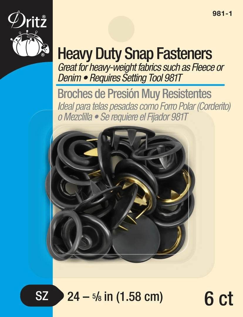 Dritz Heavy Duty Snap Fasteners are great for heavy-weight fabrics such as fleece or denim. Use these fasteners on a clothing creation project, or to replace a broken fastener. This package contains the pieces needed to create six 5/8 inch (size 24) heavy duty snap. Use with Dritz Heavy Duty Snap Tool # 981T.
