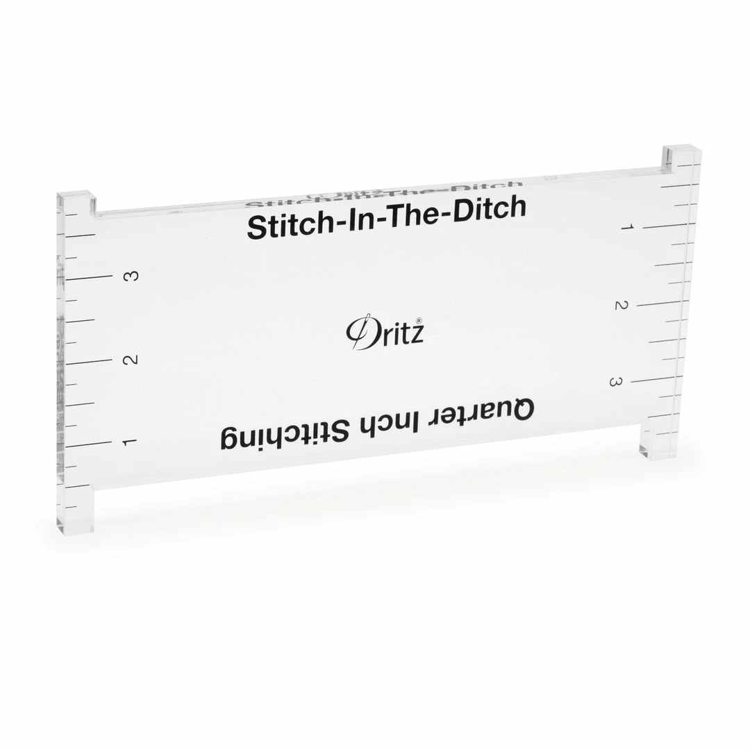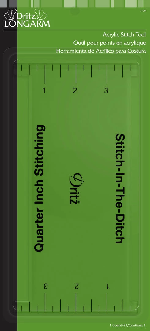 The Dritz Longarm Clear Acrylic Stitch Tool is designed to aid quilter in ‘Stitch-In-The-Ditch’ or ‘Quarter Inch Stitching’. For use with 1/4 inch presser foot on traditional machines or for longarm machines with hopping foot that has 1/4 inch between needle and edge of foot.