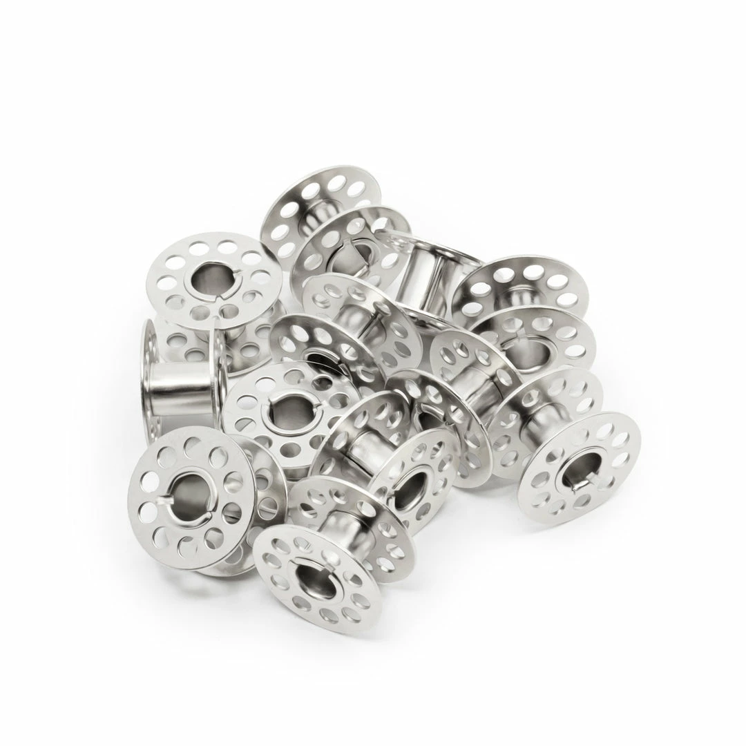 - Package includes (12) metal bobbins and (1) reusable storage box