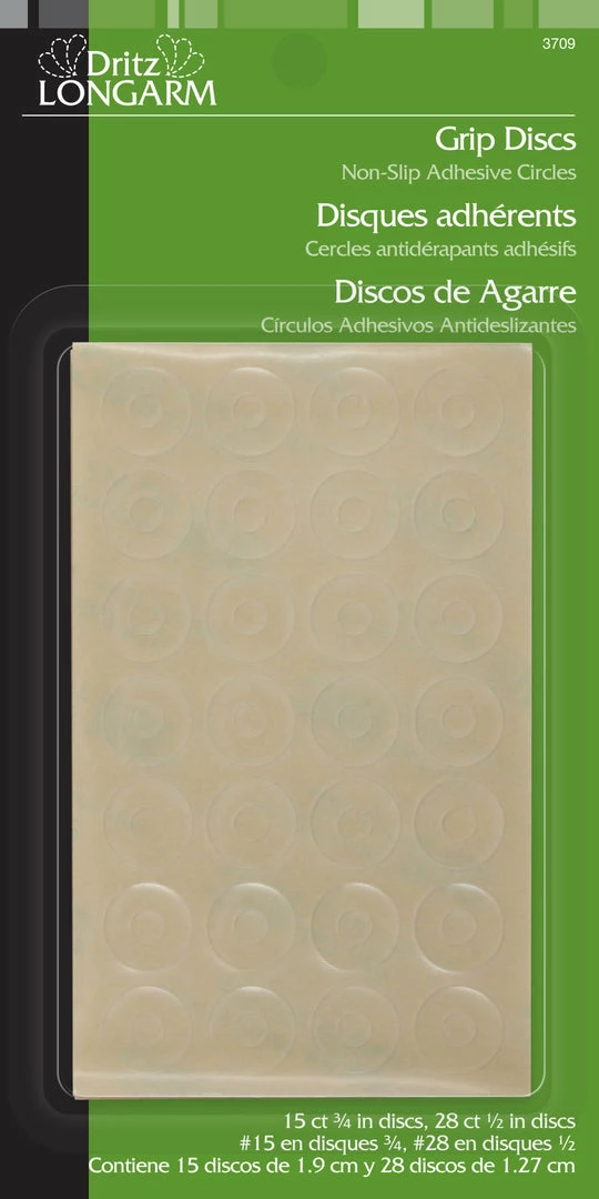 Dritz Longarm Grip Discs are non-slip adhesive circles that can be applied to the back of rulers, stencils, or templates. Two convenient sizes, for the even the smallest ruler. Easy to use and transparent color. Includes 15 ct. 3/4″ and 28 ct. 1/2″ discs
