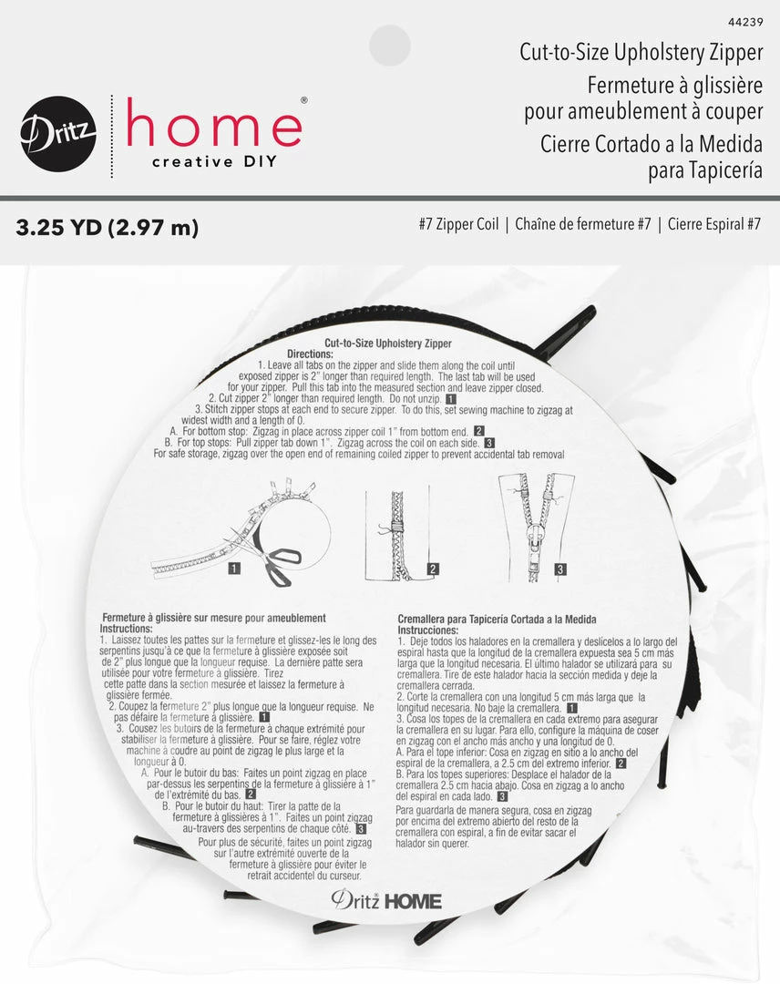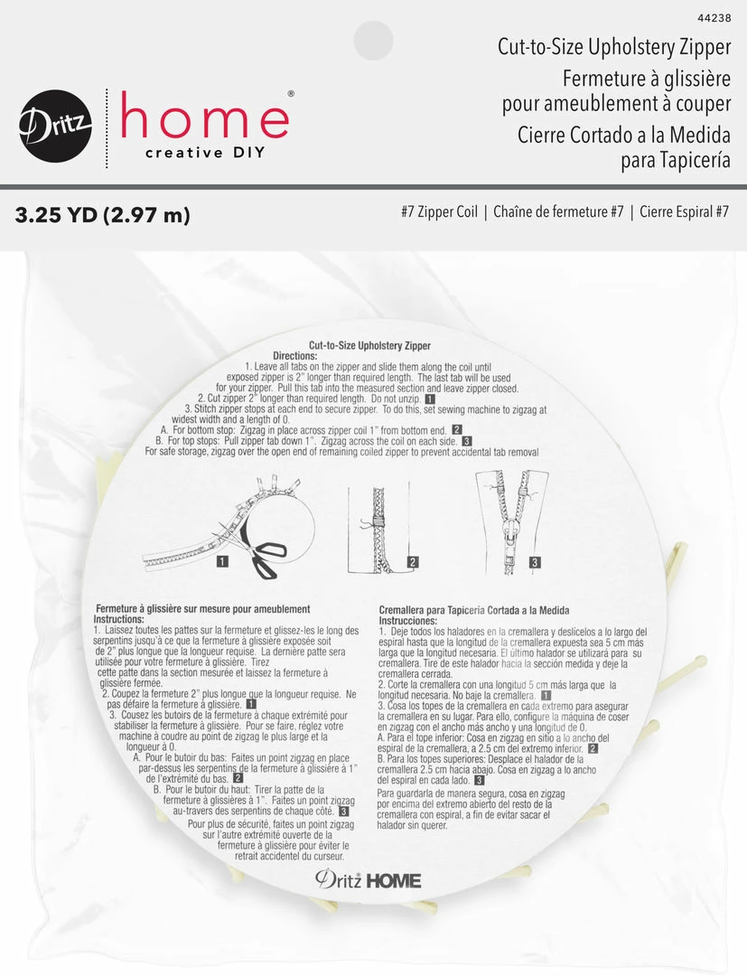 - Package includes 3-1/4 yards of Cut-To-Size Upholstery Zipper