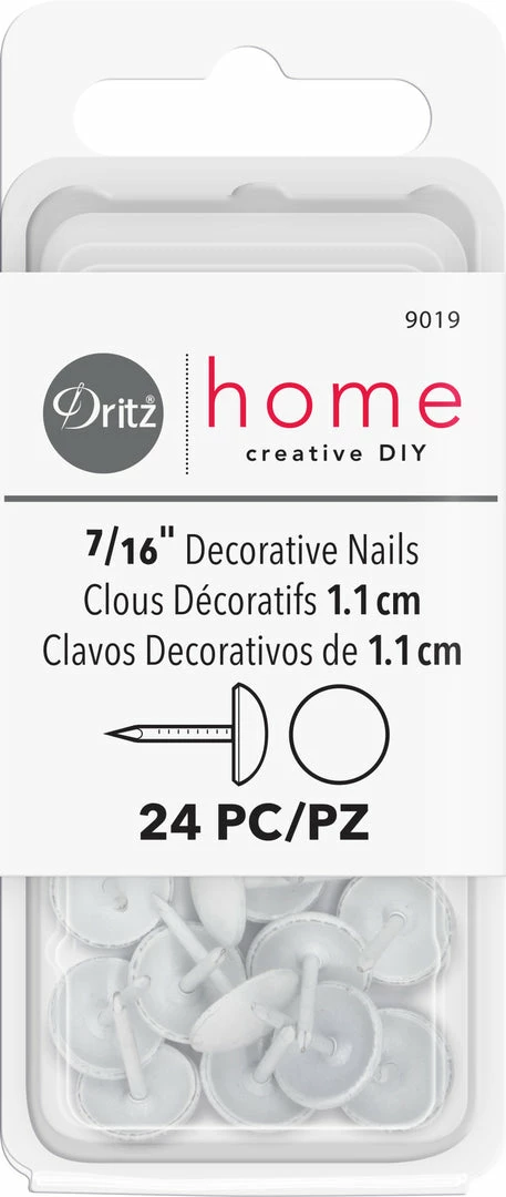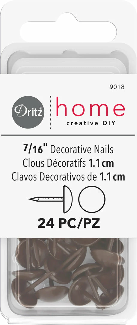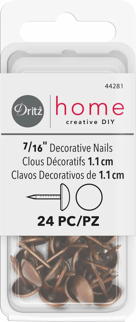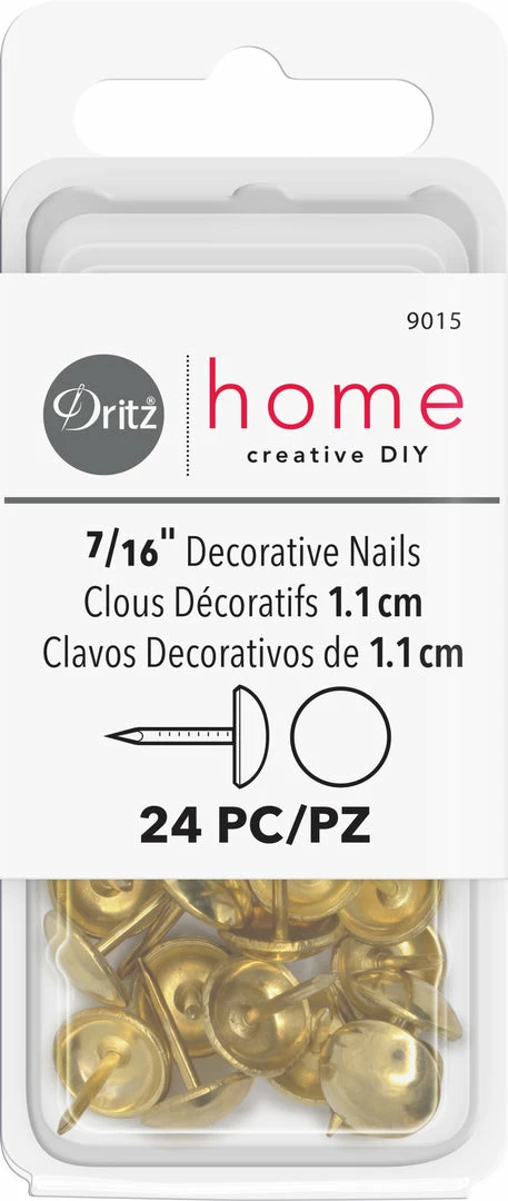 Dritz Home Decorative Nails provide function and fashion. These 7/16″ decorator nails feature a smooth round design. Designed to help with all home decorating projects and will give each project a more professional finish. They quickly and easily secure fabric and trims, finish edges. Ideal for adding detail to chairs, ottomans and accent pieces (picture frames, etc.).