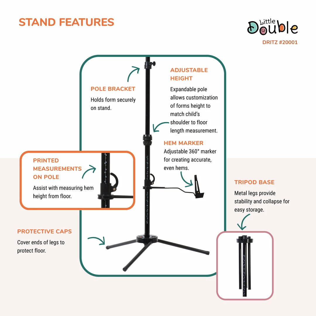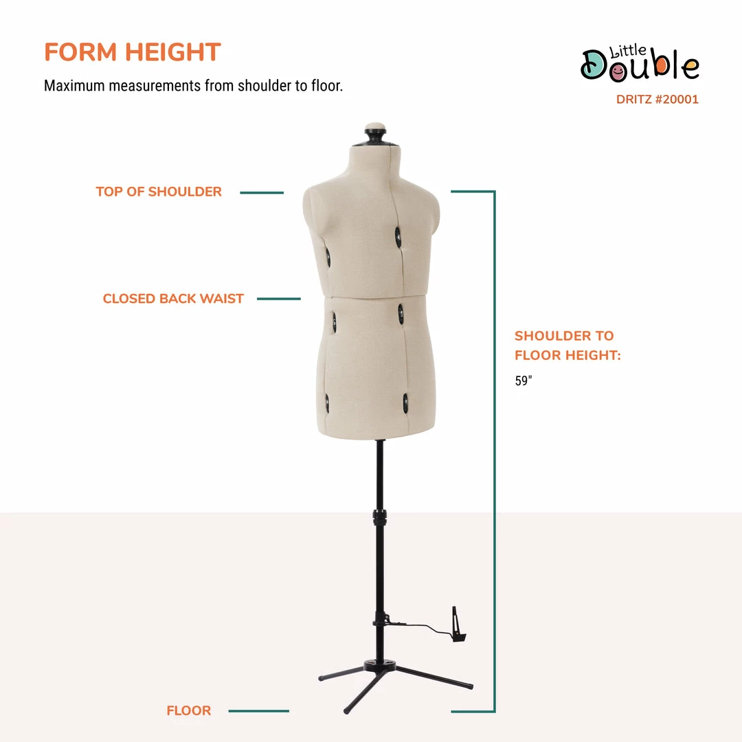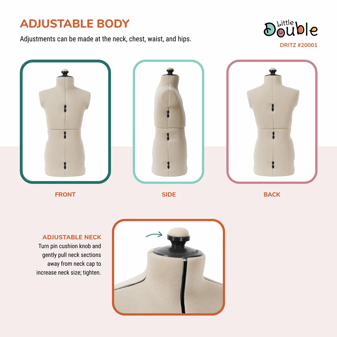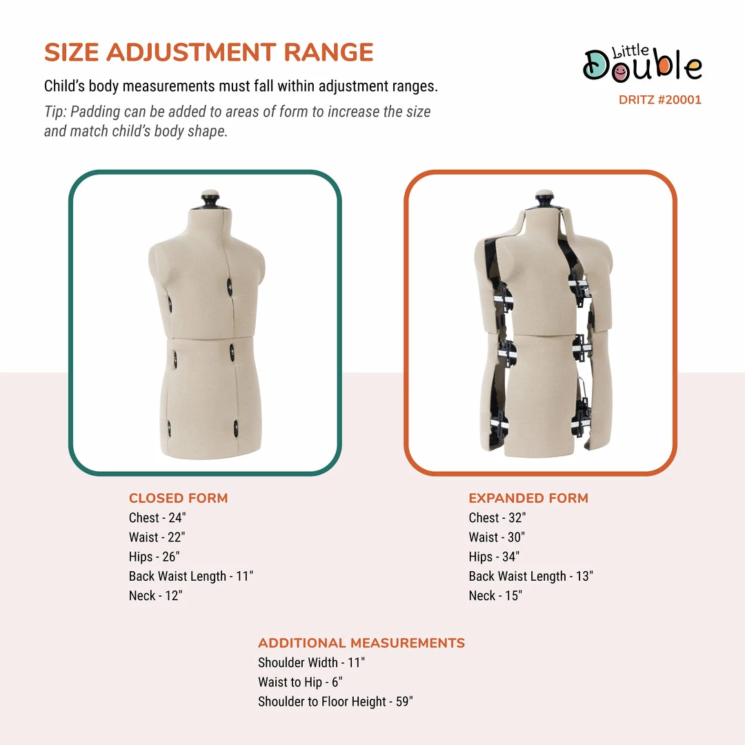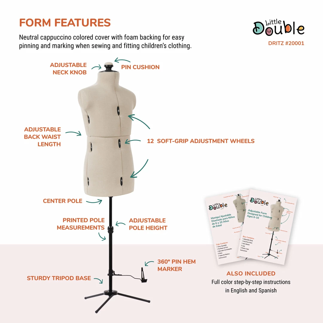 Dritz Little Double adjustable form is designed to assist in the sewing and fitting of children’s clothing. The body sizing and proportions are best suited for girls and boys in the 6 to 10 years age range.