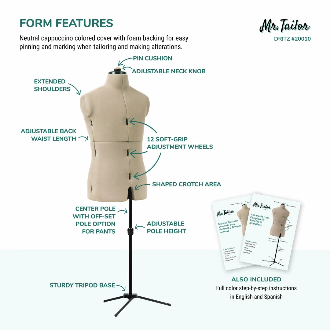 The Dritz Mr. Tailor adjustable male form has a unique design and special features to assist you when tailoring and altering men’s pants as well as shirts and jackets.