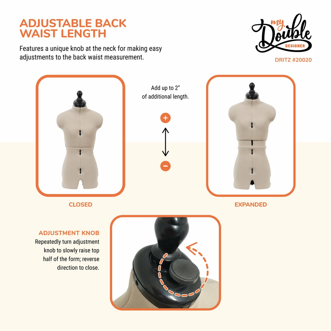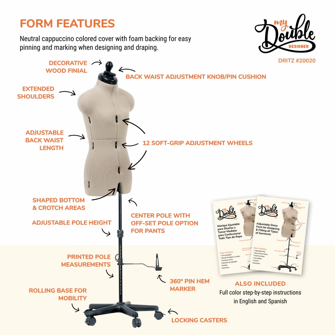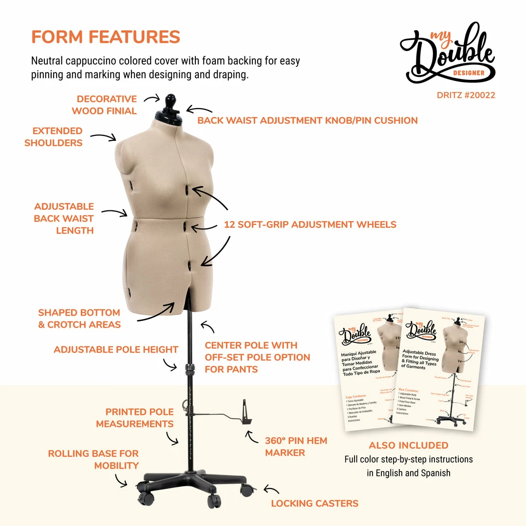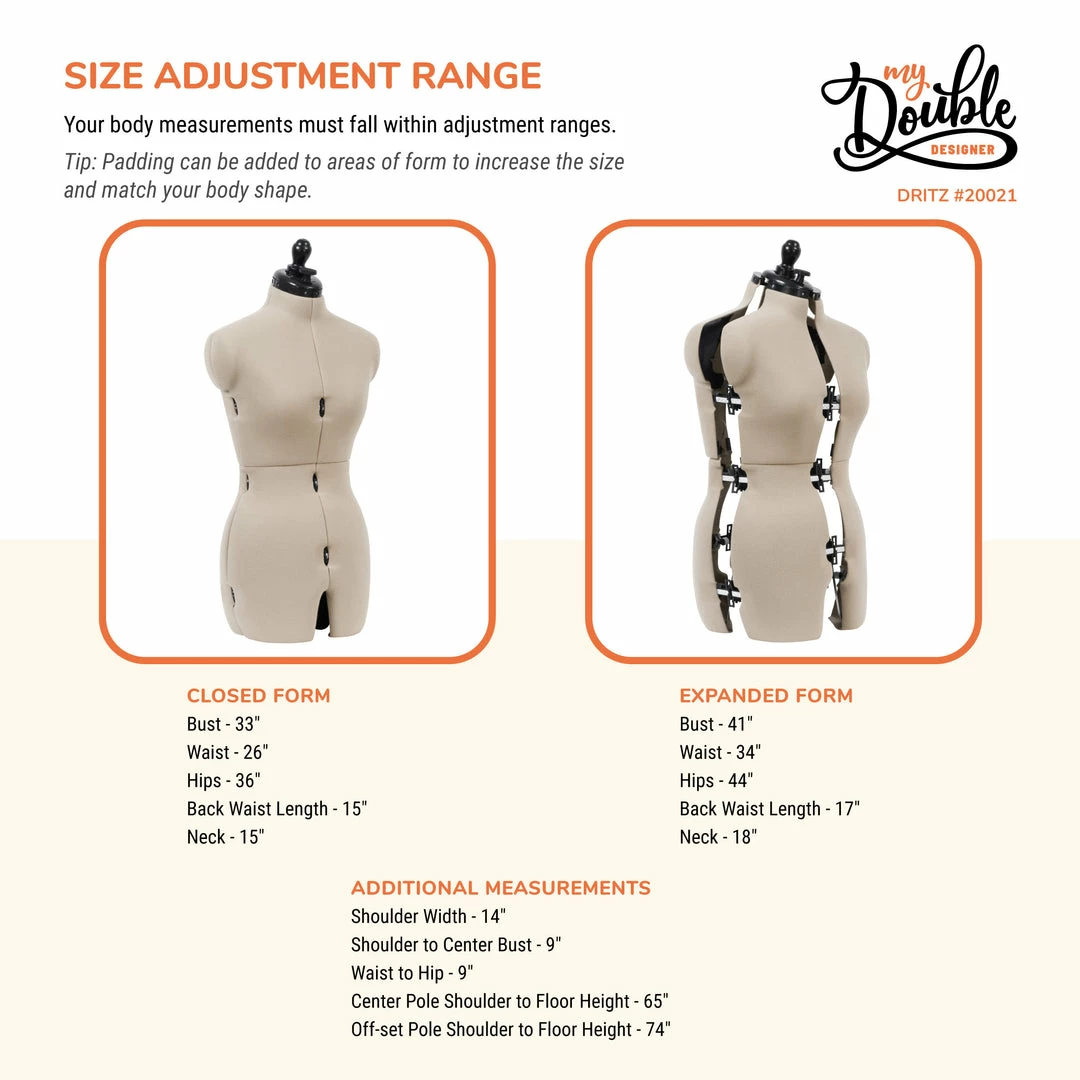 The Dritz My Double Designer Dress Forms help you fashion a double of your body providing you with professional looking garments. Use the form to audition fabrics and test the drape and overall look and feel before you start your project. The form is ideal for checking the fit of your pattern tissues and garment test muslin. The form assists with modifications and alterations to both new construction and ready-to-wear clothing that requires modifications. The forms fabric is a neutral colored cotton/polyester with foam-backing for easy pinning and marking when draping and designing.
