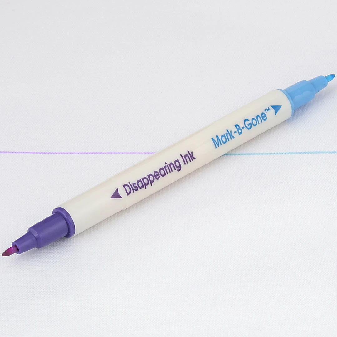 This Dritz Dual Purpose Marking Pen features a Blue Mark-B-Gone Pen on one end and a Purple Disappearing Ink Pen on the other. Use this pen to transfer pattern markings for sewing, quilting and needle crafts and for use with other projects that require marking. The blue ink wipes off with a damp cloth while the purple ink is air and water soluble.