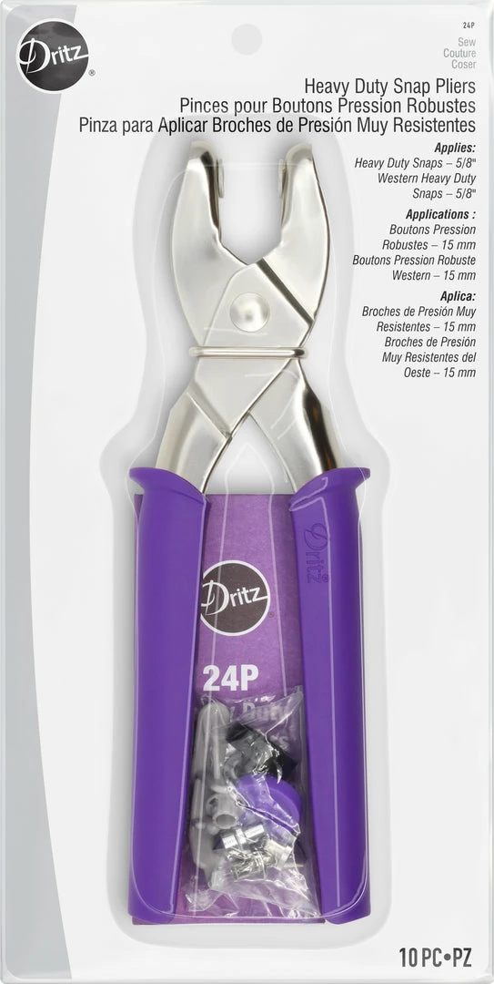 Dritz heavy duty snap pliers are used to apply functional heavy duty snaps to a variety of DIY sewing and repair projects such as jackets, coats, skiwear, and boat covers.