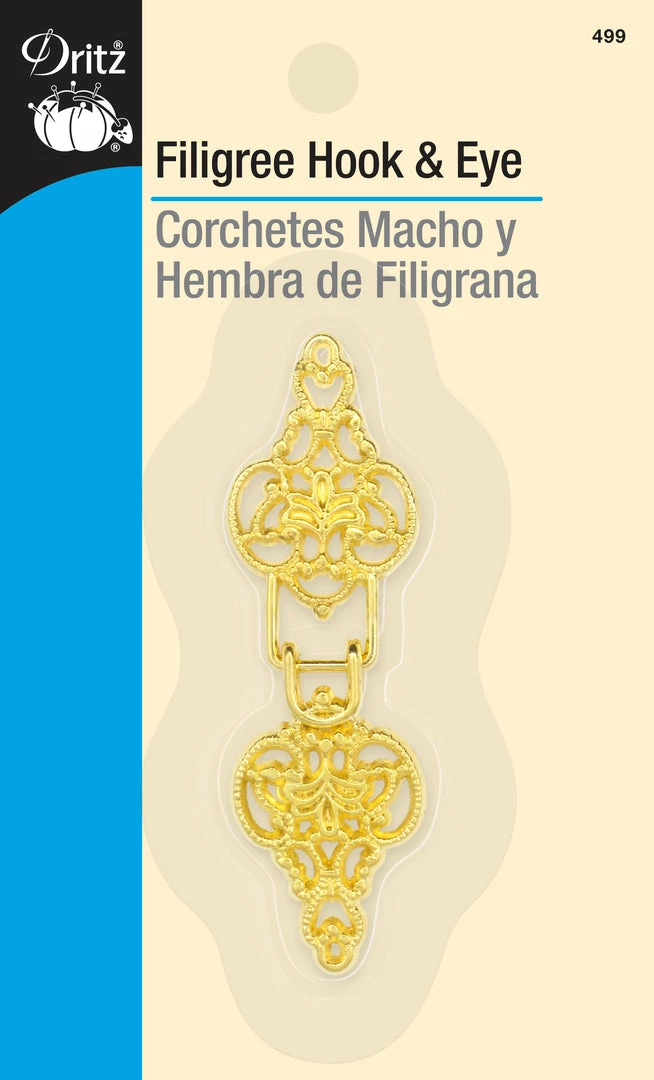 This decorative filigree hook and eye closure is perfect for holding finished edges together on coats, wraps, vests and jackets. Use for a decorative closure on vests and jackets and purses. Simply hand sew the hook to your garment using gold or monofilament thread. This hook and eye is washable and dry cleanable. This package contains 1 decorative, filigree hook and eye fastener in a gold color.