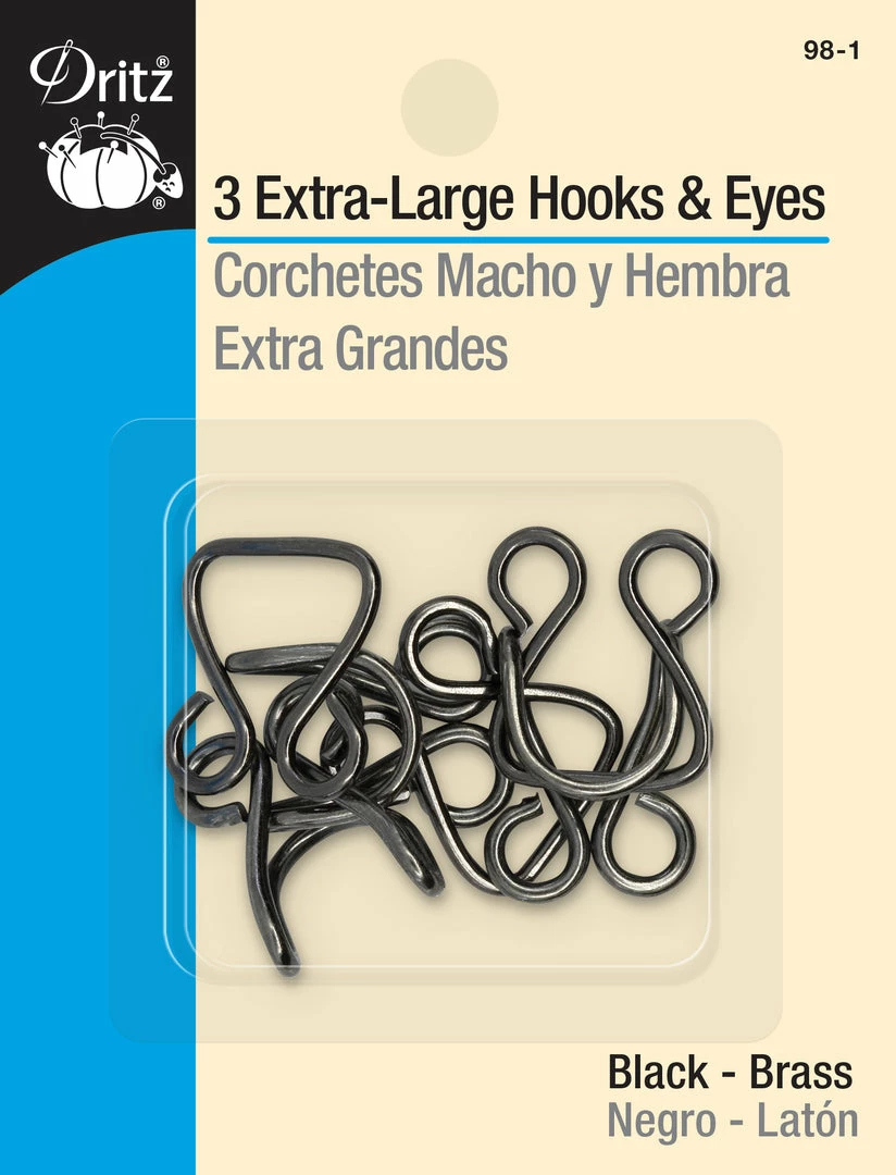 The Dritz Extra-Large Hook & Eyes Pack of 3 is a useful addition to your sewing kit. This package includes three extra-large metal hook and eye sets, which are available in a plenty of optional colors. These hook and eyes act as closures that hold finished edges together. Ideal for waistbands of skirts and pants, they are durable and easy to work with. You can even use these extra-large hook and eyes on top of your dresses and blouses.