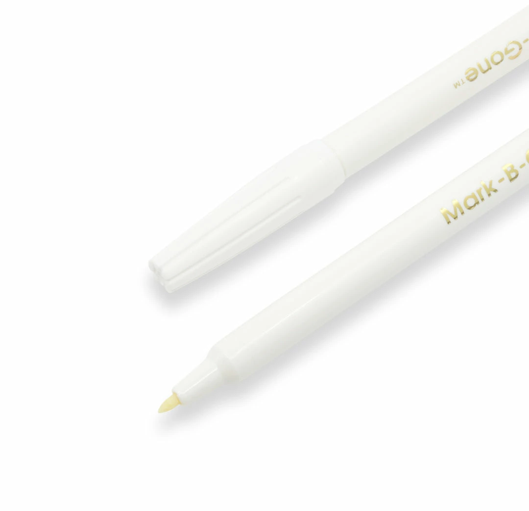 The Dritz Mark-B-Gone Marking Pen disappears when wiped off with a damp cloth. Write and erase the markings made by this pen as often as you want. Use it for marking patterns and designs on dark fabrics. A single water-soluble marking pen is included in this sleek package.