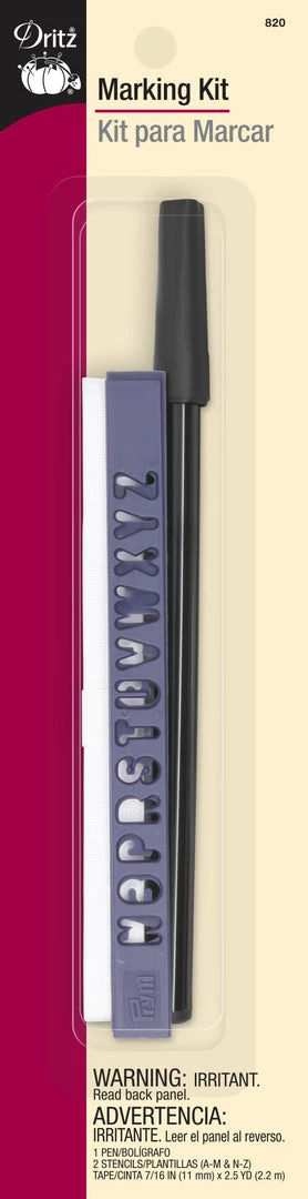 The Dritz Marking Kit can be a valuable addition to your sewing and craft kit. This package contains 7/16 in x 2-1/2 yd iron-on fabric tape, a black pen with indelible ink, an A-M stencil and an N-Z stencil. Use this marking kit to mark clothing items neatly and evenly with owners’ names. Staying permanent through many washes, it can also be used to ID items for school, camp and more.