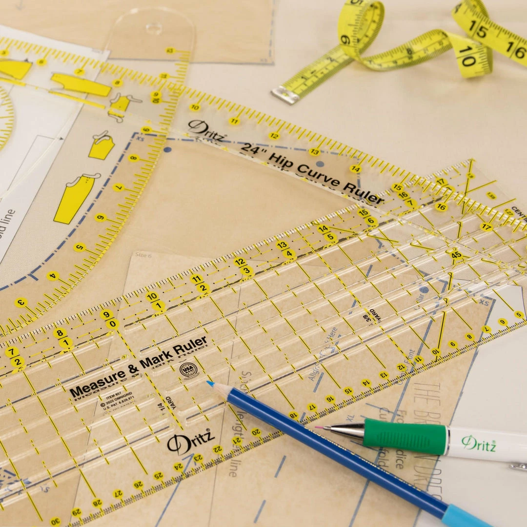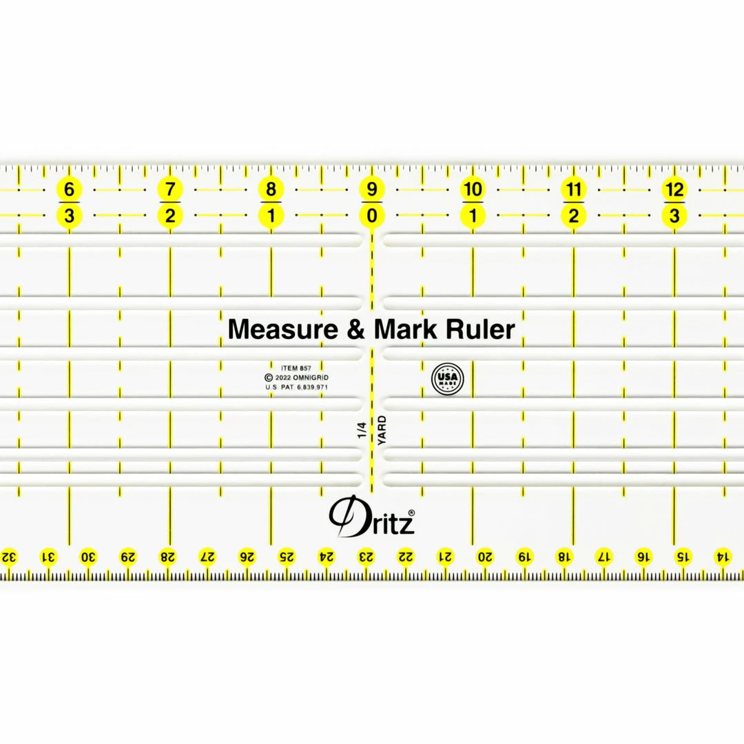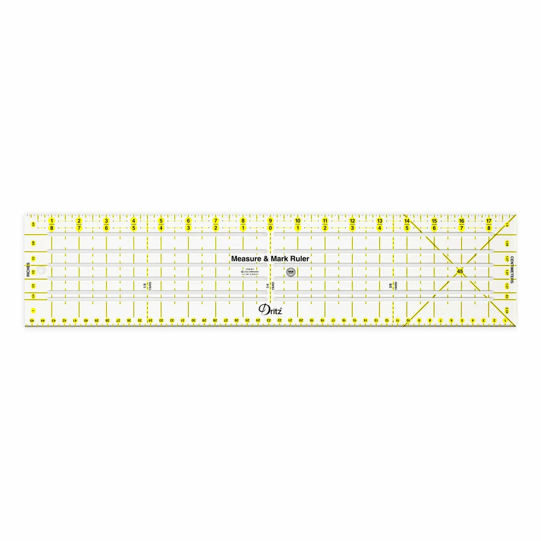 The Dritz Measure & Mark Ruler is the perfect updated sewist ruler with modern technology and built-in essentials required for garment construction, altering, and upcycling. The half yard long ruler includes 1/16″ measuring increment with metric equivalents, yardage markings, 45° bias lines, a centering ruler, and parallel slots used for measuring, marking, and cutting. The ruler is made in the USA.