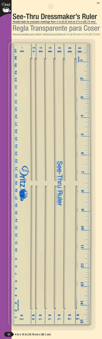 Dritz See-Thru Dressmaker’s Ruler 4” x 15” is a must-have tool in every fabric designer’s kit. Accurate numbering on this scale aids in making precise markings from 1/4 to 3-3/8 inches. The scale also features a lightweight plastic material to facilitate parallel markings. It is great for measuring and marking specific locations of buttons, appliques, lace, pockets, buttonholes and can also be used as a tracing wheel guide.
