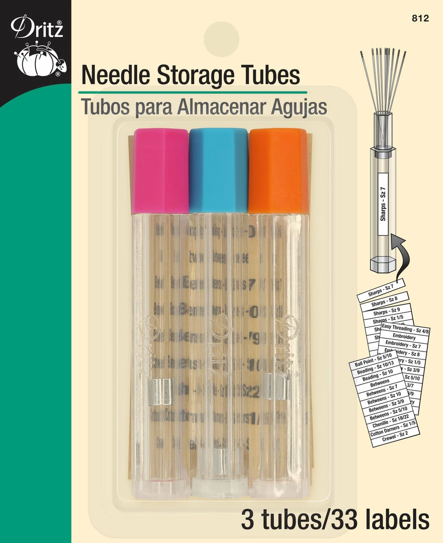 Dritz needle storage tubes with labels are a handy accessory for identifying and storing hand needles for sewing and quilting; magnetized tube easily dispenses needles for use.