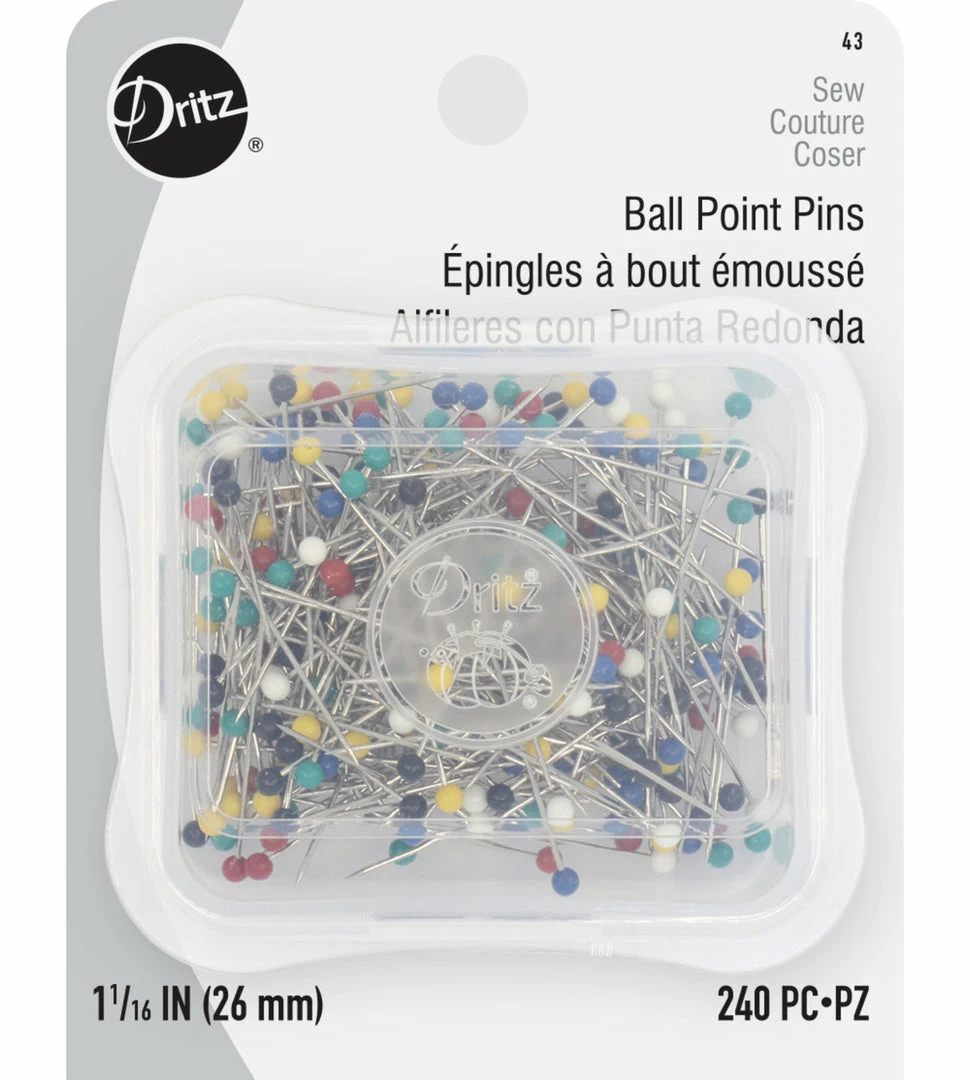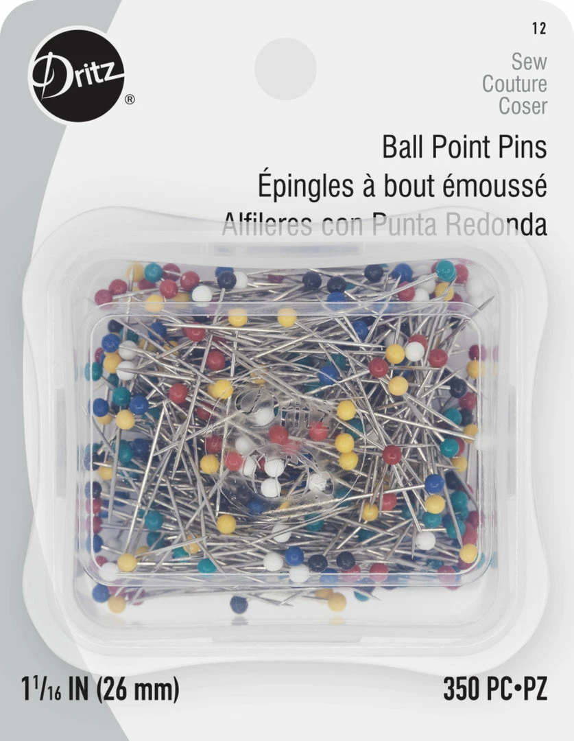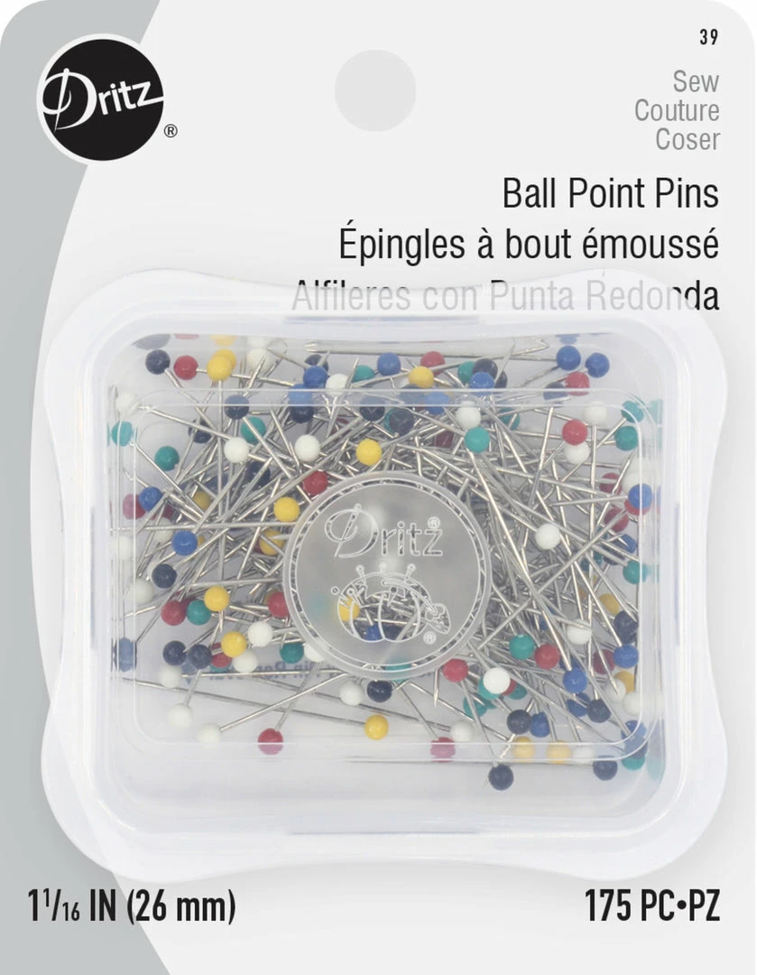 Ball Point Pins by Dritz have a rounded tip that are specially designed for knits and lingerie fabrics. These nickel-plated steel straight pins feature multi-colored heads and a 0.5mm extra fine shaft.