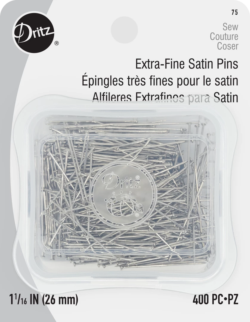 Dritz Extra-Fine Satin Pins are used for delicate and lightweight fabrics. These straight pins have an extra-fine, 0.5mm shaft and are nickel-plated steel.