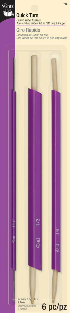 Quick Turn comes with 3 sizes of plastic cylinders and wooden rods used to push and turn fabric tubes quickly and easily.
