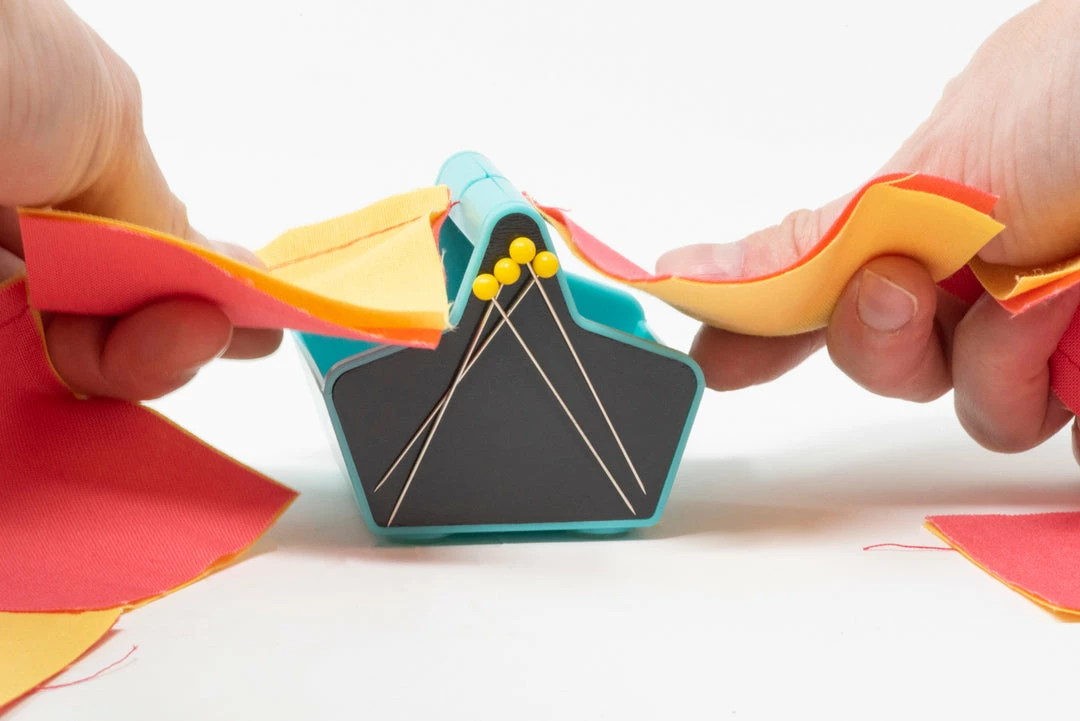 This patented Dritz table top thread cutter makes cutting apart chain pieced fabrics quick and easy. Simply slide threads between chained pieces down into the groove and soon you will have individual stacks of pieced units, ready for the next step.