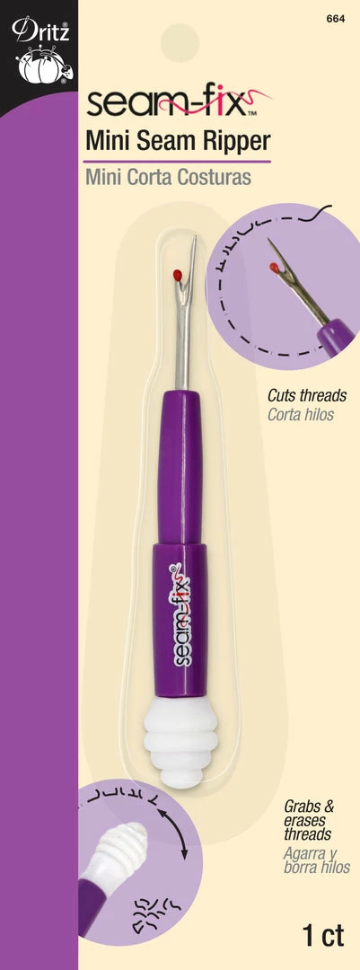 Cut unwanted stitches with ease, using the Dritz Seam-Fix Mini Seam Ripper. This easy-to-use seam ripper has a sharp blade that cuts unwanted threads, and a special tip that whisks them neatly away. Simply remove the cap, use the blade, replace the cap, and use the rubbery tip to grab and pull loose threads away.