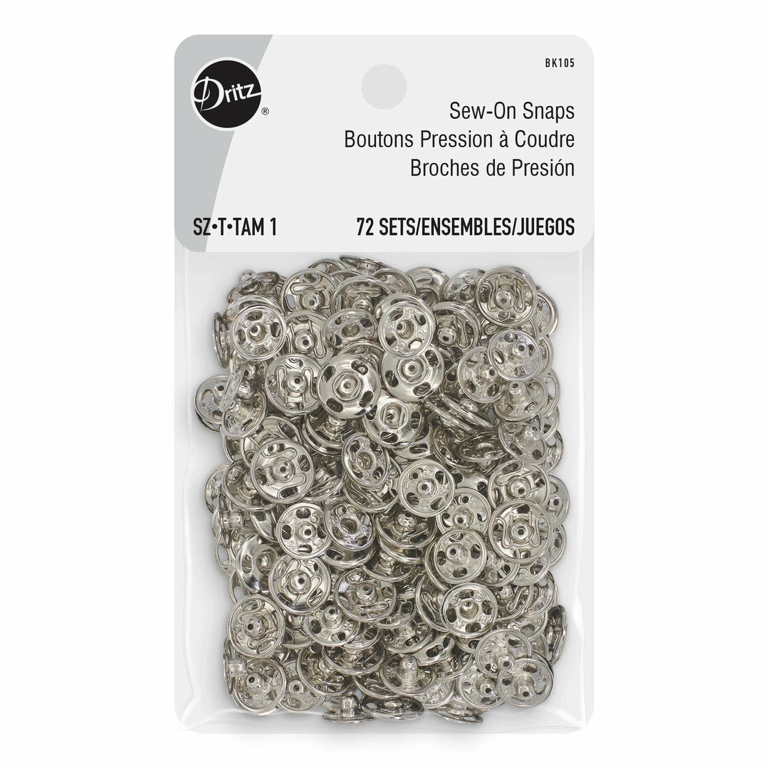 Dritz Sew-On Snaps are flat closures used to hold overlapping edges of fabric together and are ideal for use on clothing and accessories. These brass snaps have been specially crafted for durability and toughness and include four openings on the edges for stitching. Use them as garment closures on your blouses, shirts cardigans, coats and other apparel. Package contains 72 sets.