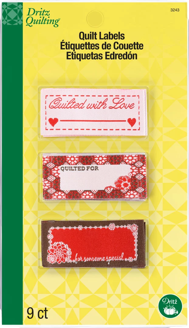The Dritz Quilting quilt labels are embroidered labels to sew into handmade projects such as quilts, garments or accessories to give them that personal touch. Each package contains 3 each of 3 different label designs and are made of 100% polyester textured yarn.
