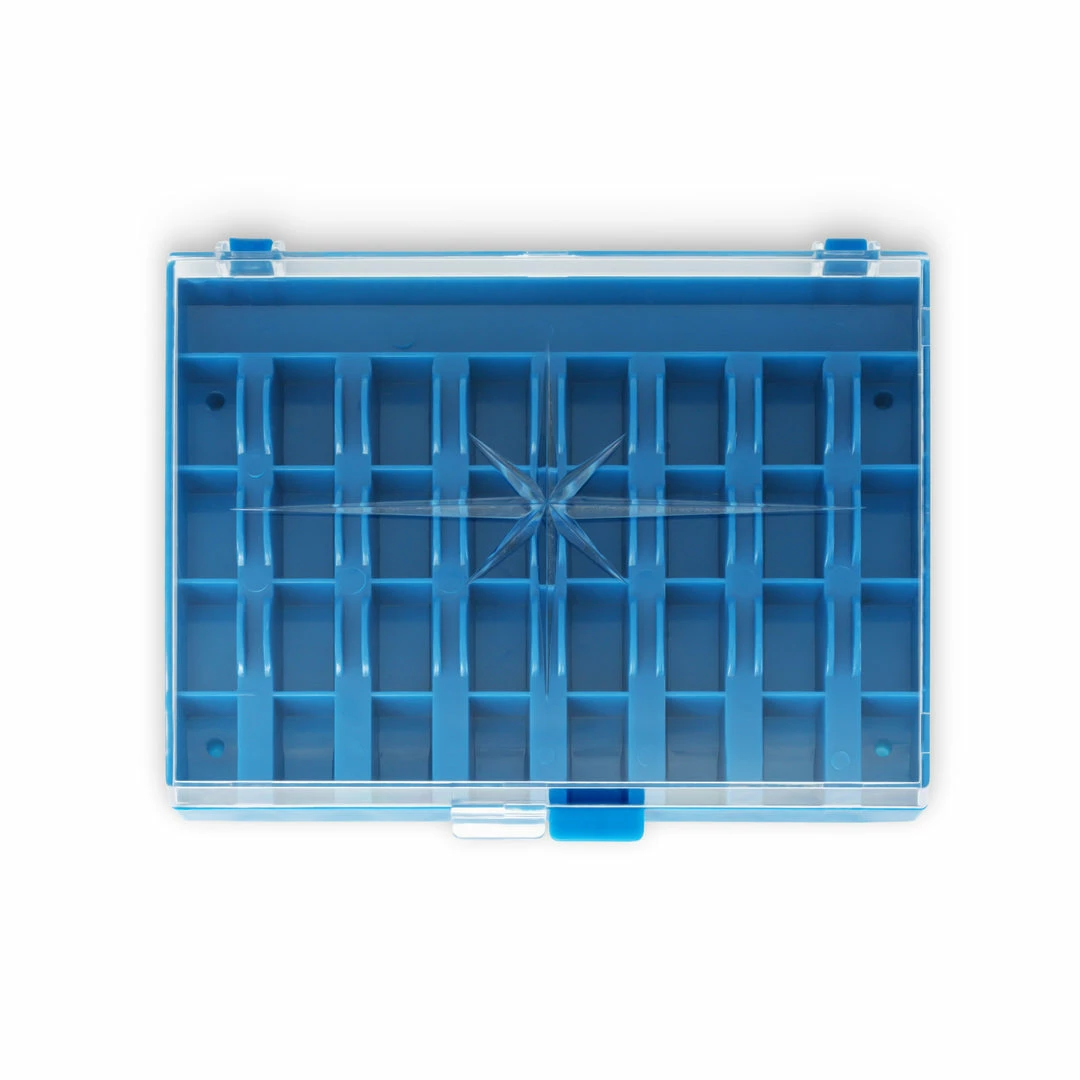 - Sturdy plastic bobbin box with latched lid