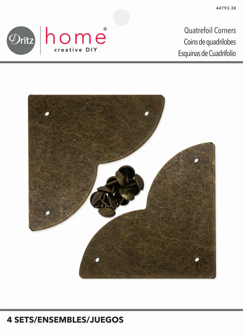 Dritz Home campaign hardware is decorative non-functioning hardware that is applied to the surface of woodworking projects to give them a professional finish – simply nail it into place using the provided nails. The straight-edged side of this quatrefoil hardware can be aligned in the corners of furniture pieces or accessories, but it can also be artfully arranged to create interesting surface patterns and designs. Campaign hardware is ideal for a variety of DIY projects such as drawers, chests, trays, boxes, mirrors and more.