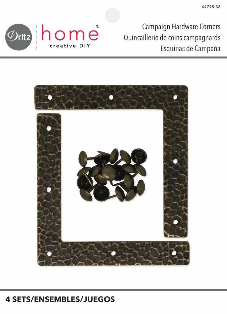 Dritz Home campaign hardware is decorative non-functioning hardware that is applied to the surface of woodworking projects to give them a professional finish – simply nail it into place using the provided nails. This “L” shaped hardware can be aligned in the corners of furniture pieces or accessories, but it can also be artfully arranged to create interesting surface patterns and designs. Campaign hardware is ideal for a variety of DIY projects such as drawers, chests, trays, boxes, mirrors and more.