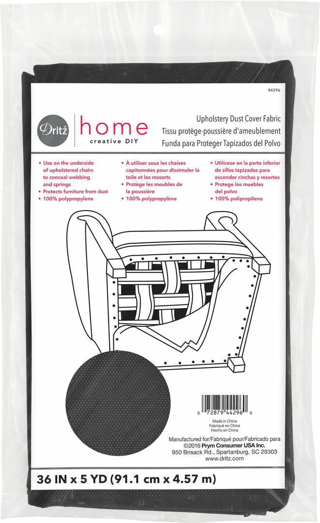 The Dritz Home Upholstery Dust Cover Fabric 36-inch x 5 yards is perfect to protect your furniture from dust. This pack contains five yards of 36-inch wide upholstery dust cover fabric in a charcoal shade. Made of 100% polypropylene, this non-woven upholstery fabric is designed to be used on the underside of upholstered chairs and sofas to conceal webbing and springs.
