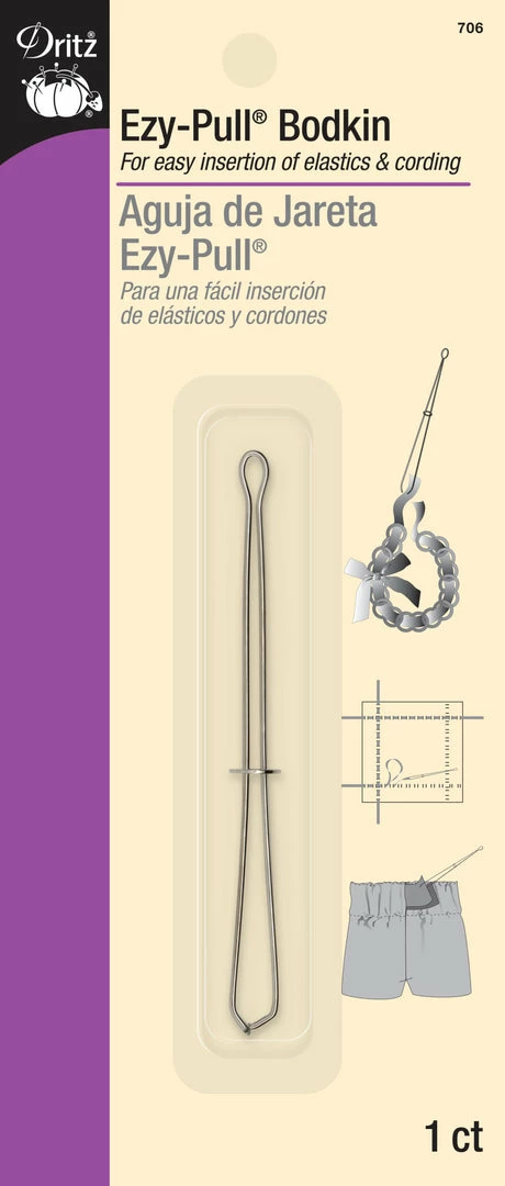 Thread elastics & ribbons and replace drawstrings effortlessly using the Dritz Ezy-Pull Bodkin. The pack contains one bodkin which allows you to perform twist-free threading of elastic and other thin fibers. This threader and tweezer tool features special ‘teeth’ that grip well and are held together by a sliding ring. Simply clamp the bodkin over the elastic, slide the ring to lock into place and thread through the casing.