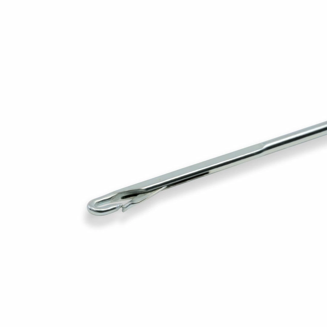 - Made of wire, hooked end grabs and hangs on to fabric as you pull