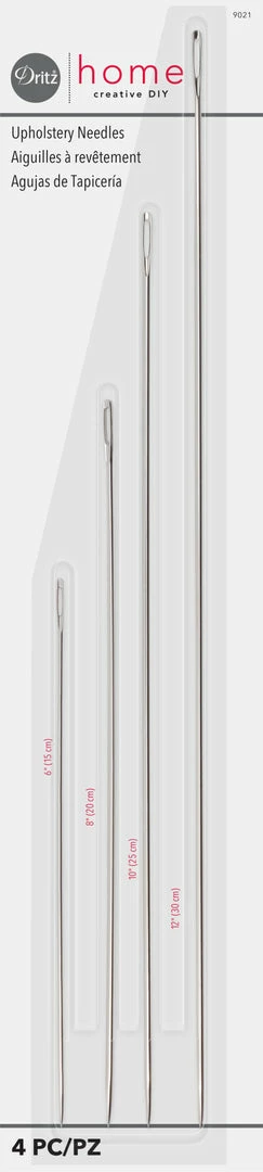 Dritz Home Long Straight Upholstery Hand Needles make it easier to tie springs to webbing, stitch edges and sew through padding. This pack features 10 and 12 inch needles to tuft, attach buttons and secure spring bottoms to webbing. These upholstery needles are available as 4 pieces in a single pack.