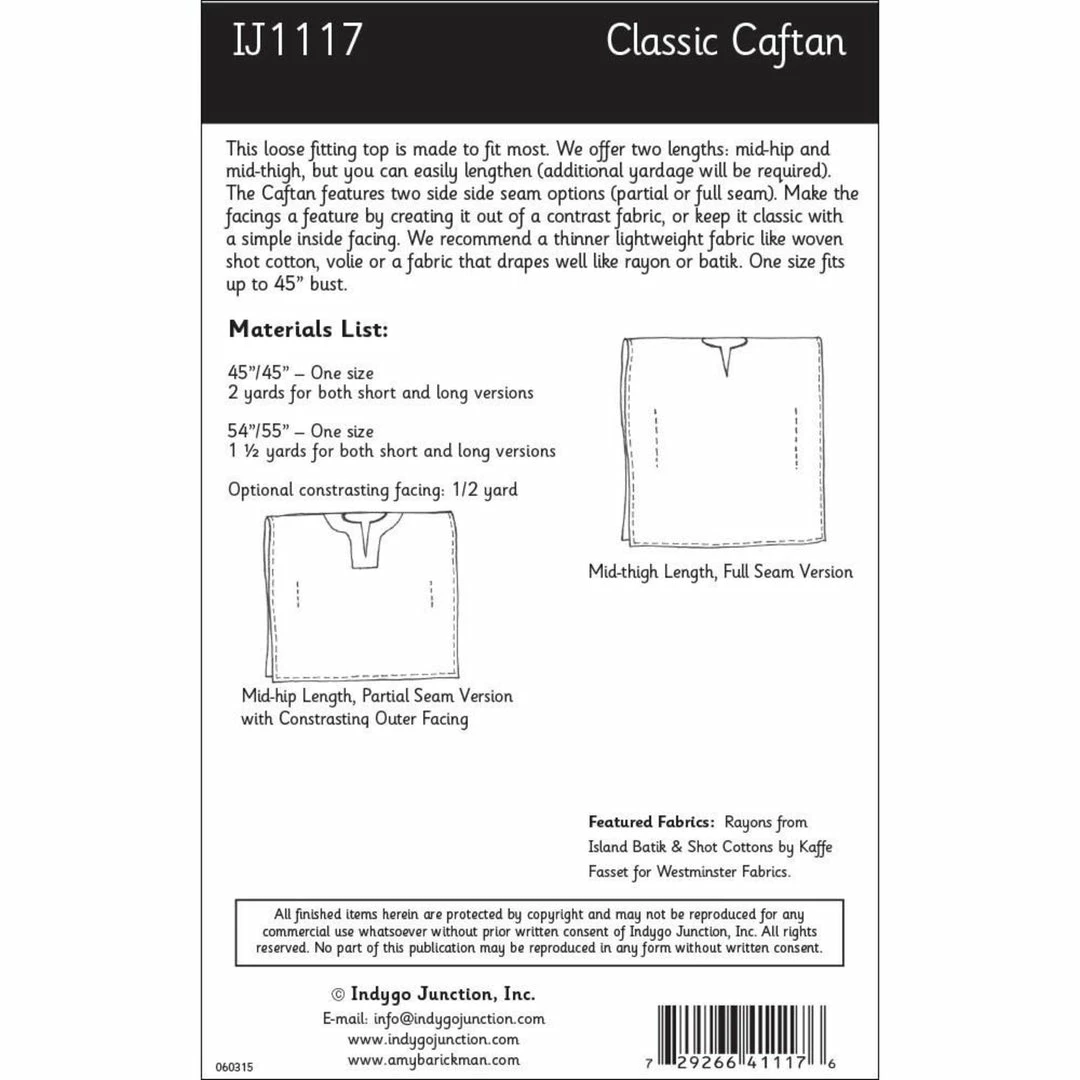 This loose fitting top is made to fit most. We offer two lengths: mid-hip and mid-thigh, but you can easily lengthen (additional yardage will be required). The Caftan features two side side seam options (partial or full seam). Make the facings a feature by creating it out of a contrast fabric, or keep it classic with a simple inside facing. We recommend a thinner lightweight fabric like woven shot cotton, voile or a fabric that drapes well like rayon or batik. One size fits up to 45″ bust.