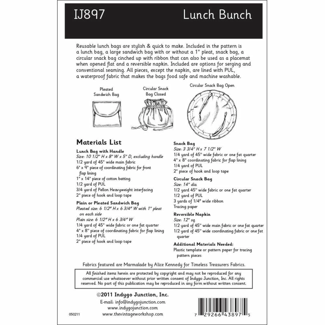 Included in the pattern is a lunch sack, a large sandwich bag with or without a 1″ pleat, snack bag, a circular snack bag cinched up with ribbon or cord that can also be used as a placemat when opened flat (approx. size 14″ dia.) and a reversible napkin. Included are options for serging and conventional seaming. All pieces are lined with PUL, a waterproof fabric that makes the bags food safe and machine washable.