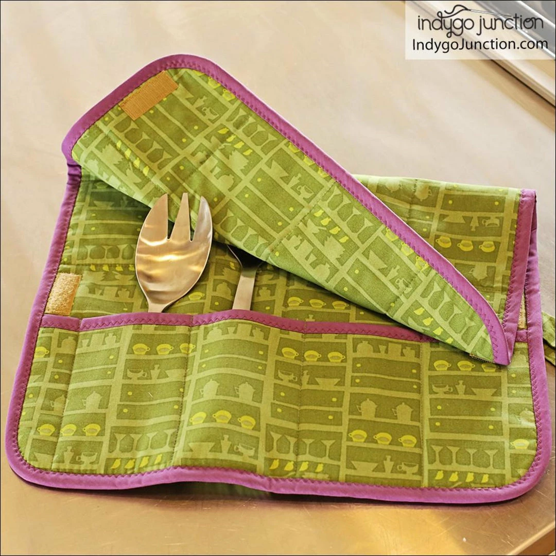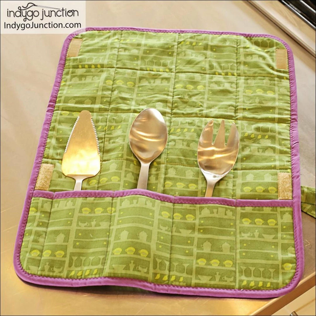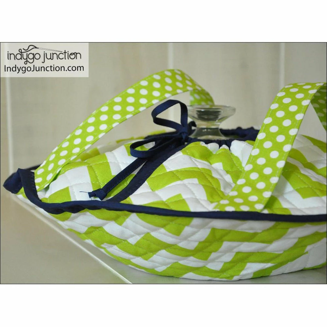 Two-piece travel set to take your goodies on the go. Circular (15″ diameter) casserole/pie carrier can be made pieced sun-ray style or solid, then quilted with your favorite technique. Insulated batting keeps items warm. Handles & drawstring closures keep dishes secure. Bring your serving ware along with fold & tie roll (16″ x 21″ open).