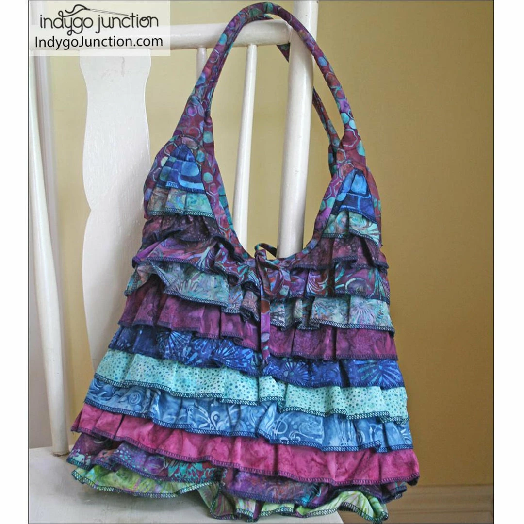 This flirty feminine purse features ruffles galore with serged edges highlighted using variegated or contrasting thread. The ruffles can be made using jelly rolls or 2-1/2″ strips of your favorite fabrics. There are two handle attachment options included; one handle is attached directly to the purse, while the other handle is connected with rings. An inside pocket completes the purse. Size 13″ x 23″.