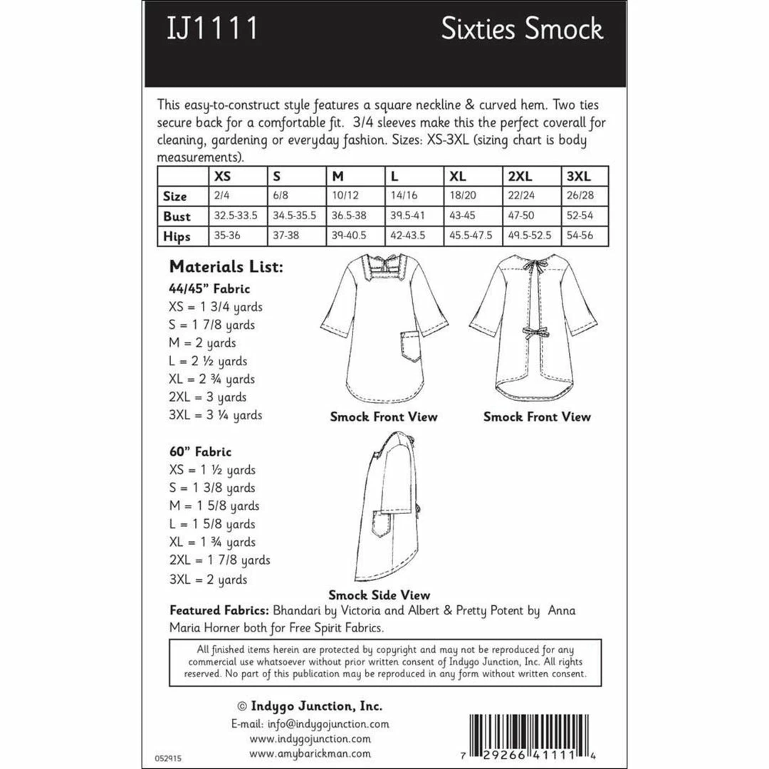This easy-to-construct style features a square neckline & curved hem. Two ties secure back for a comfortable fit. 3/4 sleeves make this the perfect coverall for cleaning, gardening or everyday fashion. Sizes: XS-3XL.