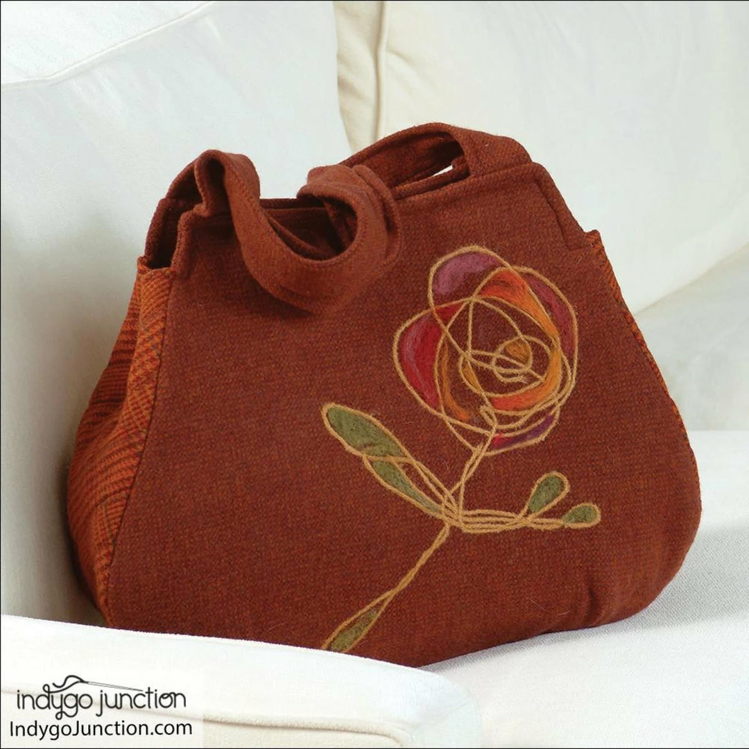 This shoulder tote features sturdy construction, inside pockets, and magnetic closure. The natural linen version features fabric quilted with shrinking thread to add more dimension. The stenciling is highlighted with embroidery to give the design more definition. Try the needle felted design with yarn and fill in with roving to add color and interest. Size: 13″ tall x 18″ wide x 6″ deep, excluding two shoulder length handles.