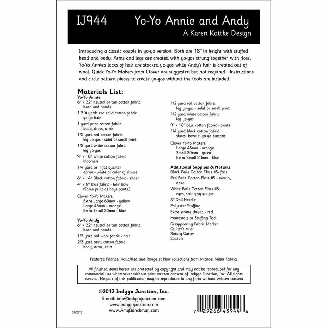 Introducing a classic couple in yo-yo version. Both are 18″ in height with stuffed head and body. Arms and legs are created with yo-yos strung together with floss. Yo-Yo Annie’s locks of hair are stacked yo-yos while Andy’s hair is created out of wool. Quick Yo-Yo Makers from Clover are suggested but not required. Instructions and circle pattern pieces to create yo-yos without the tools are included.