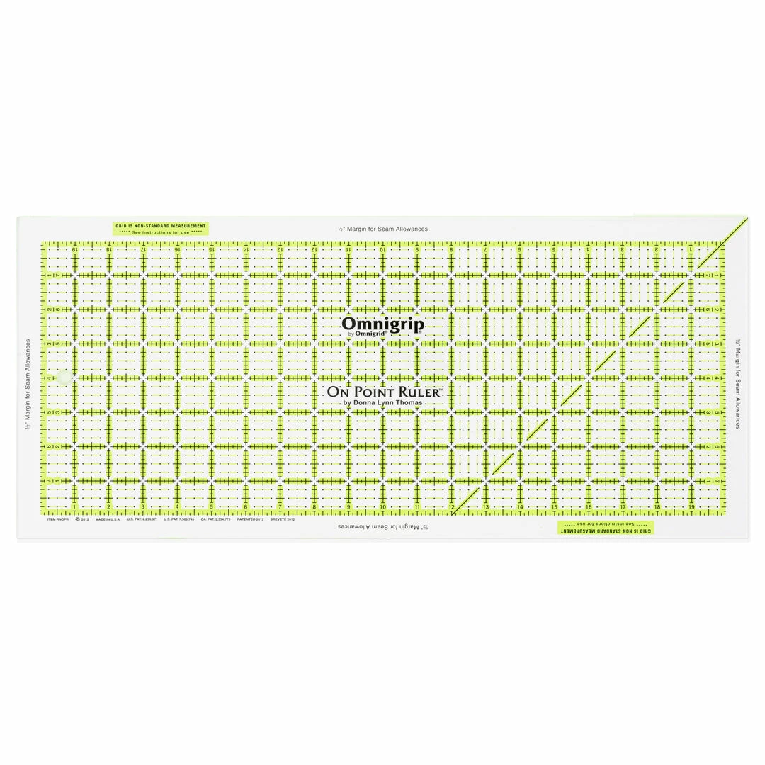 The Omnigrip On Point Ruler is an innovative cutting tool used to create squares, rectangles or triangles that will be set on point when quilting. It creates cut pieces that will measure evenly across their diagonals instead of from side-to-side.