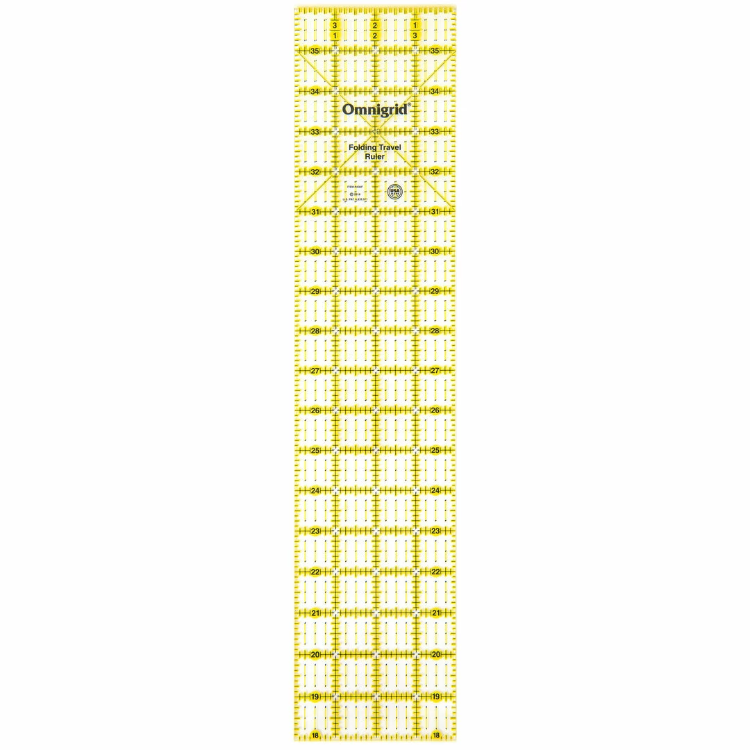 The Omnigrid folding ruler offers the most popular Omnigrid size in a portable folding design. Extended, the folding ruler is long enough to cut folded bolted fabric and is great for trimming finished quilt tops. The handy folding design makes it easy to store or travel. Omnigrid heavy-duty acrylic rulers have patented double sight lines, making the grid lines easy to see on light and dark fabrics. Made in the USA.