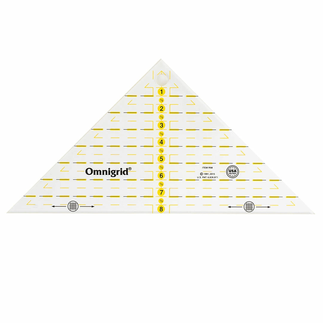 The Omnigrid square triangle ruler is used to create quarter and half square triangles for finished quilt blocks; it has seam allowance calculations included in the measurements.